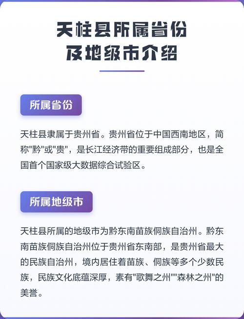 贵州天柱县属于黔东南苗族侗族自治州,首府为凯里市。以下是关于贵州天柱县及其所属州市的详细解行政区划 天柱县是贵州省黔东南苗族侗族自治州下辖的一个自治县,全称为天柱苗族侗族自治县。这意味着天柱县在行政上隶属于黔东南苗族侗族自治州,而黔东南苗族侗族自治州的首府是凯里市。
